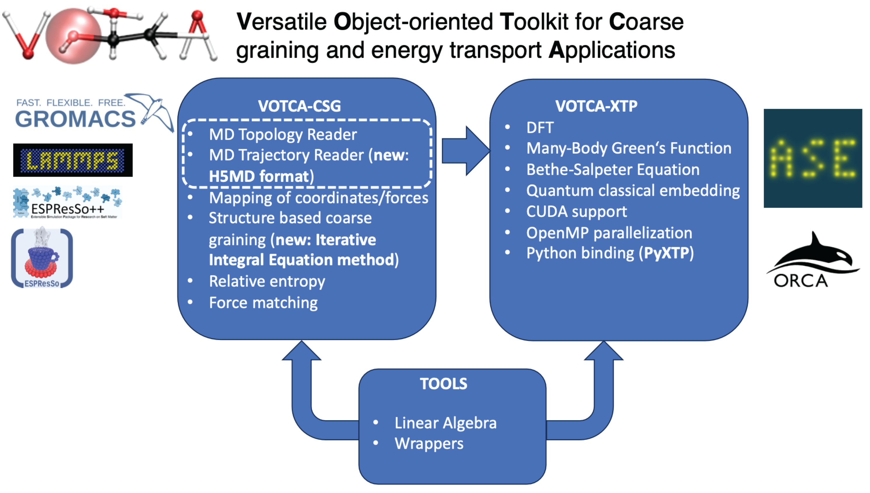 The Versatile Object-Oriented Toolkit for Coarse-graining Applications (VOTCA) provides multiscale frameworks built on a comprehensive set of methods for the development of classical coarse-grained potentials (VOTCA-CSG) as well as state-of-the art excited state electronic structure methods based on density-functional and many-body Green’s function theories, coupled in mixed quantum-classical models and used in kinetic network models (VOTCA-XTP).