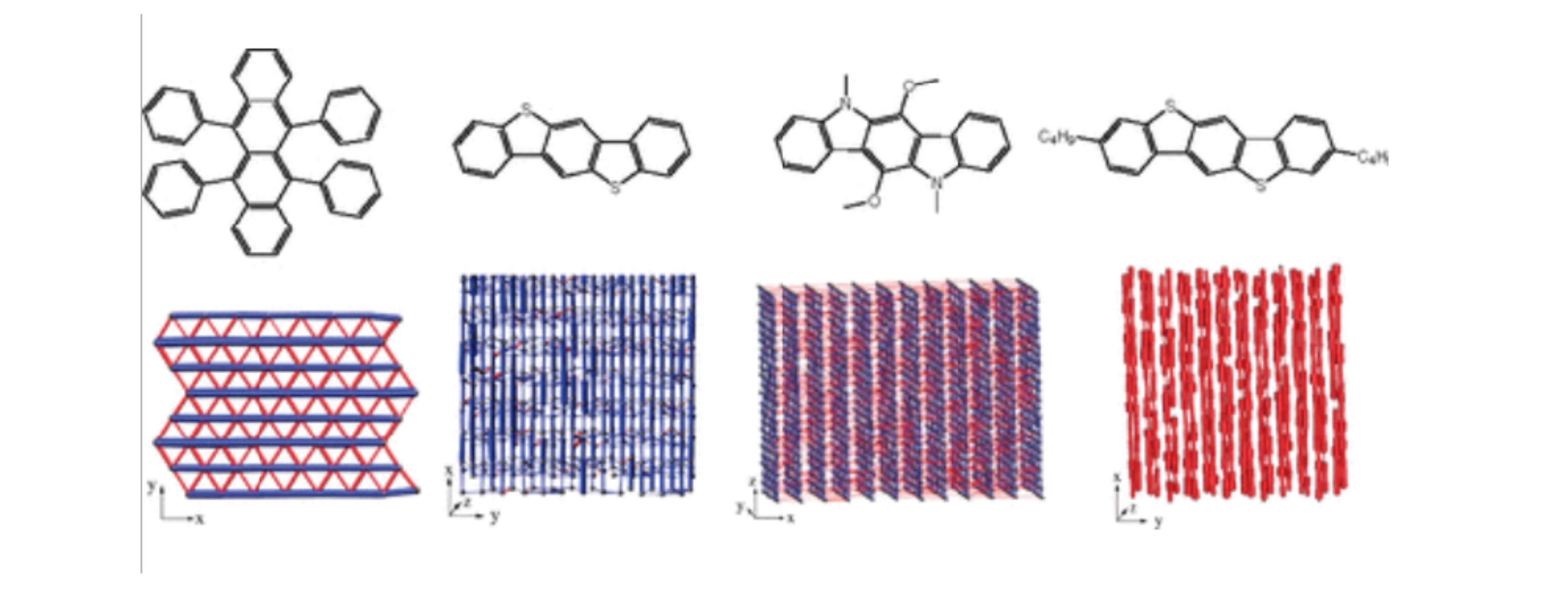 We analyze the relationship among the molecular structure, morphology, percolation network, and charge carrier mobility in four organic crystals: rubrene, indolo[2,3-b]carbazole with CH3 side chains, and benzo[1,2-b:4,5-b′]bis[b]benzothiophene derivatives with and without C4H9 side chains. Morphologies are generated using an all-atom force field, while charge dynamics is simulated within the framework of high-temperature nonadiabatic Marcus theory or using semiclassical dynamics. We conclude that, on the length scales reachable by molecular dynamics simulations, the charge transport in bulk molecular crystals is mostly limited by the dynamic disorder, while in self-assembled monolayers the static disorder, which is due to the slow motion of the side chains, enhances charge localization and influences the transport dynamics. We find that the presence of disorder can either reduce or increase charge carrier mobility, depending on the dimensionality of the charge percolation network. The advantages of charge transporting materials with two- or three-dimensional networks are clearly shown.