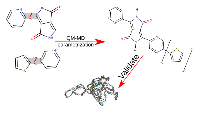 We develop an all-atom force field for a series of diketopyrrolopyrrole polymers with two aromatic pyridine substituents and a variable number of π-conjugated thiophene units in the backbone (DPP2PymT), used as donor materials in organic photovoltaic devices. Available intrafragment parameterizations of the individual fragment building blocks are combined with interfragment bonded and nonbonded parameters explicitly derived from density functional theory calculations. To validate the force field, we perform classical molecular dynamics simulations of single polymer chains with m = 1, 2, 3 in good and bad solvents and of melts. We observe the expected dependence of the chain conformation on the solvent quality, with the chain collapsing in water, and swelling in chloroform. The glass-transition temperature for the polymer melts is found to be in the range of 340–370 K. Analysis of the mobility of the conjugated segments in the polymer backbone reveals two relaxation processes: a fast one with a characteristic time at room temperature on the order of 10 ps associated with nearly harmonic vibrations and a slow one on the order of 100 ns associated with temperature-activated cis–trans transitions.