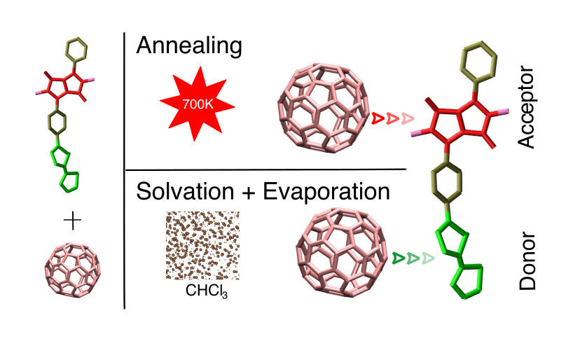 We study the effect of solvent-free annealing and explicit solvent evaporation protocols in classical molecular dynamics simulations on the interface properties of a blend of a diketopyrrolopyrrole (DPP) polymer with conjugated substituents (DPP2Py2T) and PCBM[60]. We specifically analyze the intramolecular segmental mobility of the different polymer building blocks as well as intermolecular radial and angular distribution functions between donor and acceptor. The annealing simulations reveal an increase of the glass-transition temperature of 45 K in the polymer-fullerene blend compared to that of pure DPP2Py2T. Our results show that the effective solvent evaporation rates at room temperature only have a minor influence on the segmental mobility and intermolecular orientation, characterized in all cases by a preferential arrangement of PCBM[60] close to the electron-donating substituents in DPP2Py2T. In contrast, solvent-free annealing from a liquid yields clustering of the fullerene close to the electron-withdrawing DPP, generally considered to be detrimental for application in organic solar cells. We find that the difference can be attributed to differences in the behavior of 2-hexyldecyl side-chains, which collapse toward DPP when solvent is explicitly removed, thereby blocking access of PCBM[60].