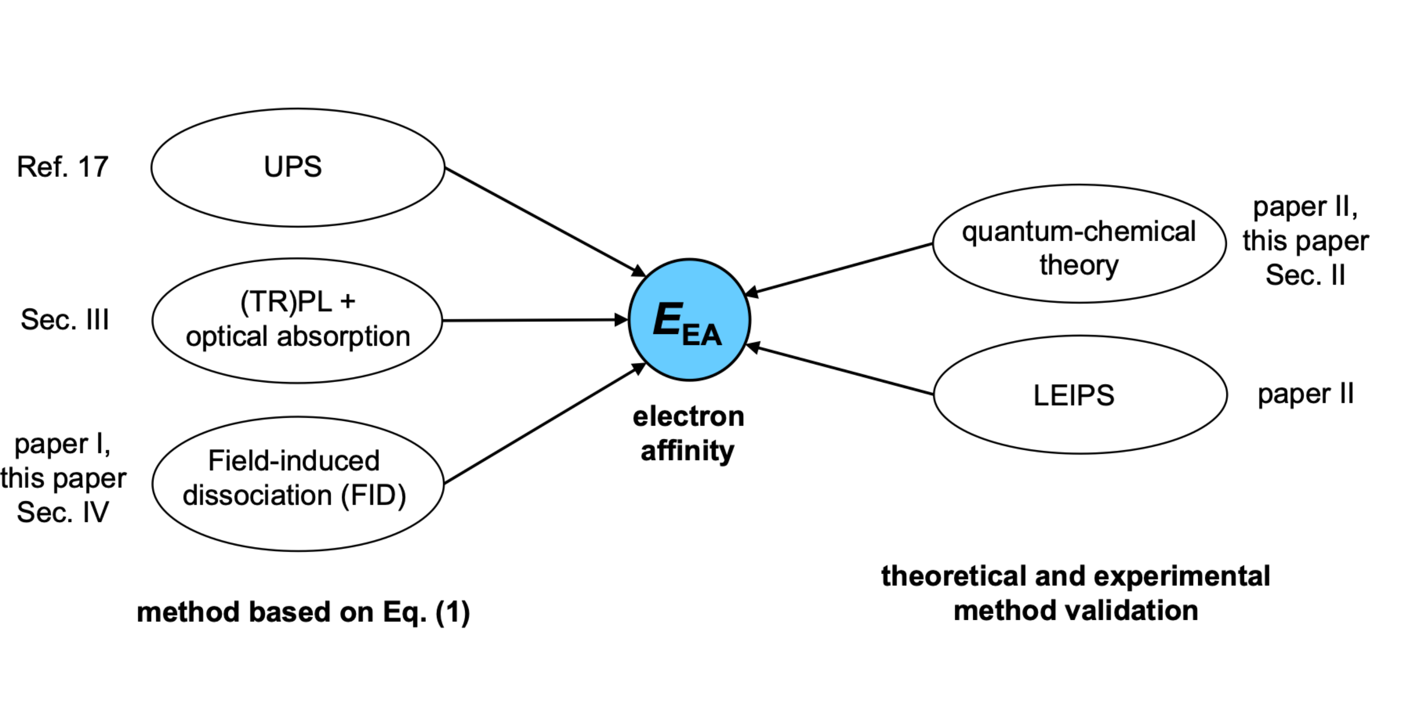 A method is developed for deducing the electron affinity of disordered organic semiconductors from spectroscopic thin-film studies of the ionization energy and the optical gap energy, combined with field-induced dissociation (FID) device experiments that are analyzed with kinetic Monte Carlo simulations using a methodology that has been presented by de Jong et al., Phys. Rev. B 112, 224202 (2025). The FID experiments are carried out for a set of eight organic semiconductor materials that are often used in organic light-emitting diodes. The analysis is focused on the 𝛼 and 𝛽 isomers of the blue fluorescent emitter material 2-methyl-9,10-di-naphthyl-anthracene. For these two materials, the experimental ionization energy, the optical gap energy, the exciton binding energy, and the electron affinity are shown to be consistent with the results of quantum-chemical calculations, presented by G. Tirimbò et al., Phys. Rev. B 112, 224203 (2025). For all fluorescent emitter materials studied, the FID experiments reveal an exciton binding energy of approximately 1.0–1.2 eV, whereas for a thermally activated delayed fluorescence material, a slightly smaller value is obtained.