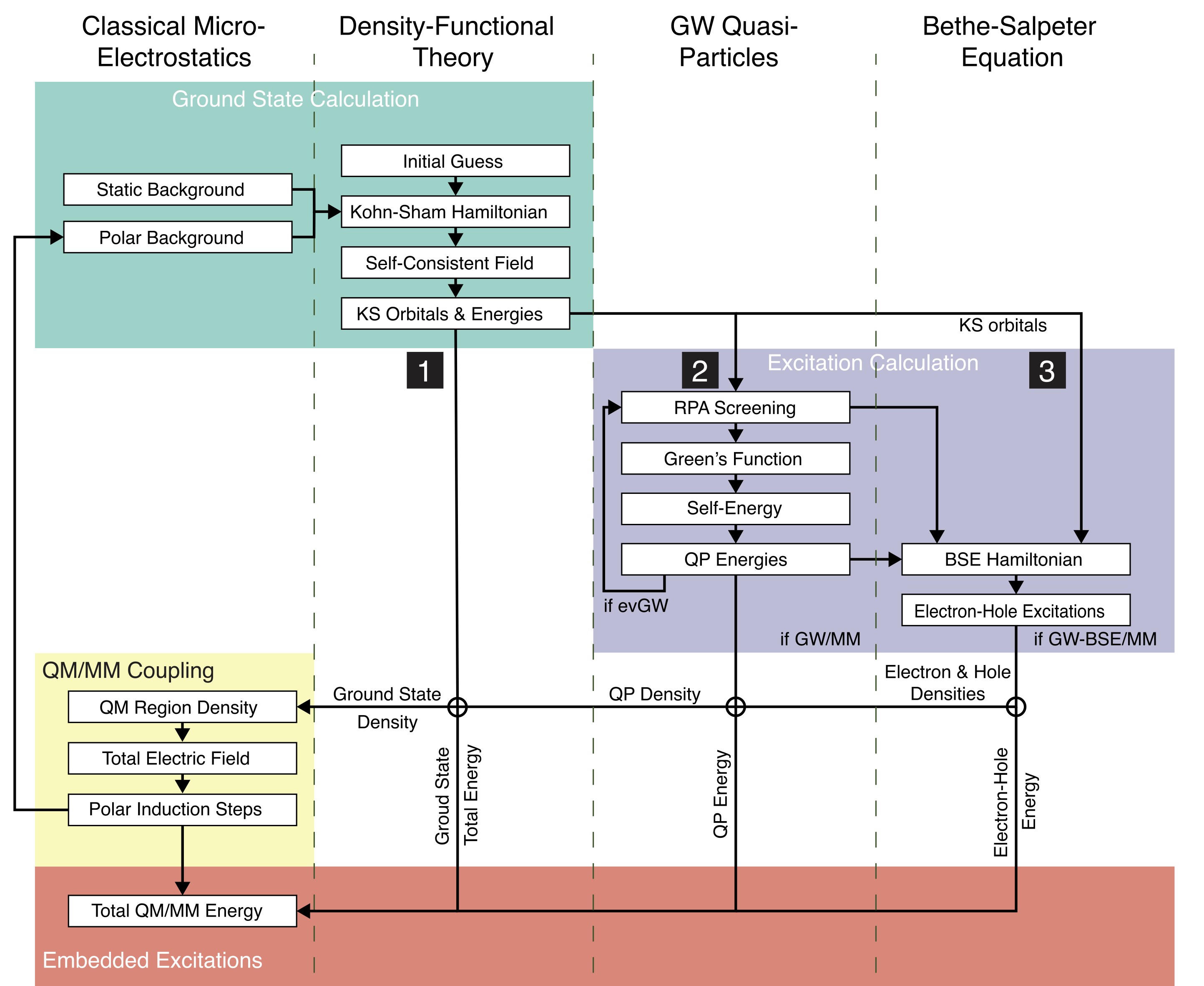 Many-body Green’s function theory in the GW approximation with the Bethe–Salpeter equation (BSE) provides a powerful framework for the first-principles calculations of single-particle and electron-hole excitations in perfect crystals and molecules alike. Application to complex molecular systems, e.g., solvated dyes, molecular aggregates, thin films, interfaces, or macromolecules, is particularly challenging as they contain a prohibitively large number of atoms. Exploiting the often localized nature of excitation in such disordered systems, several methods have recently been developed in which GW-BSE is applied to a smaller, tractable region of interest that is embedded into an environment described with a lower-level method. Here, we review the various strategies proposed for such embedded many-body Green’s functions approaches, including quantum-quantum and quantum-classical embeddings, and focus in particular on how they include environment screening effects either intrinsically in the screened Coulomb interaction in the GW and BSE steps or via extrinsic electrostatic couplings.