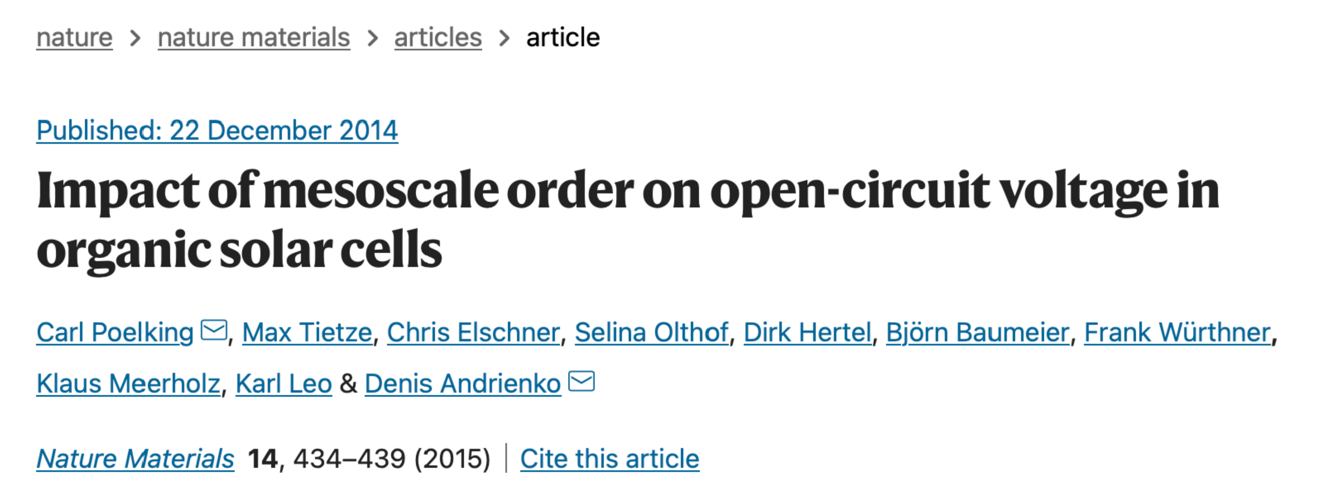 Structural order in organic solar cells is paramount: it reduces energetic disorder, boosts charge and exciton mobilities, and assists exciton splitting. Owing to spatial localization of electronic states, microscopic descriptions of photovoltaic processes tend to overlook the influence of structural features at the mesoscale. Long-range electrostatic interactions nevertheless probe this ordering, making local properties depend on the mesoscopic order. Using a technique developed to address spatially aperiodic excitations in thin films and in bulk, we show how inclusion of mesoscale order resolves the controversy between experimental and theoretical results for the energy-level profile and alignment in a variety of photovoltaic systems, with direct experimental validation. Optimal use of long-range ordering also rationalizes the acceptor–donor–acceptor paradigm for molecular design of donor dyes. We predict open-circuit voltages of planar heterojunction solar cells in excellent agreement with experimental data, based only on crystal structures and interfacial orientation.