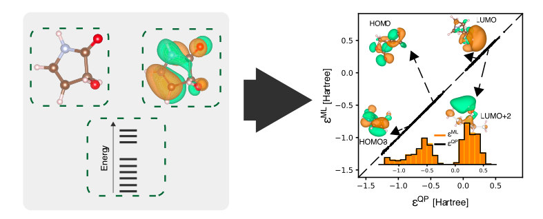 We present a Δ-machine learning approach for the prediction of GW quasiparticle energies (ΔMLQP) and photoelectron spectra of molecules and clusters, using orbital-sensitive representations (OSRs) based on molecular Cartesian coordinates in kernel ridge regression-based supervised learning. Coulomb matrix, bag-of-bond, and bond-angle-torsion representations are made orbital-sensitive by augmenting them with atom-centered orbital charges and Kohn–Sham orbital energies, both of which are readily available from baseline calculations at the level of density functional theory (DFT). We first illustrate the effects of different constructions of the OSRs on the prediction of frontier orbital energies of 22k molecules of the QM8 data set and show that it is possible to predict the full photoelectron spectrum of molecules within the data set using a single model with a mean absolute error below 0.1 eV. We further demonstrate that the OSR-based ΔMLQP captures the effects of intra- and intermolecular conformations in application to water monomers and dimers. Finally, we show that the approach can be embedded in multiscale simulation workflows, by studying the solvatochromic shifts of quasiparticle and electron–hole excitation energies of solvated acetone in a setup combining molecular dynamics, DFT, the GW approximation, and the Bethe–Salpeter equation. Our findings suggest that the ΔMLQP model allows us to predict quasiparticle energies and photoelectron spectra of molecules and clusters with GW accuracy at DFT cost.