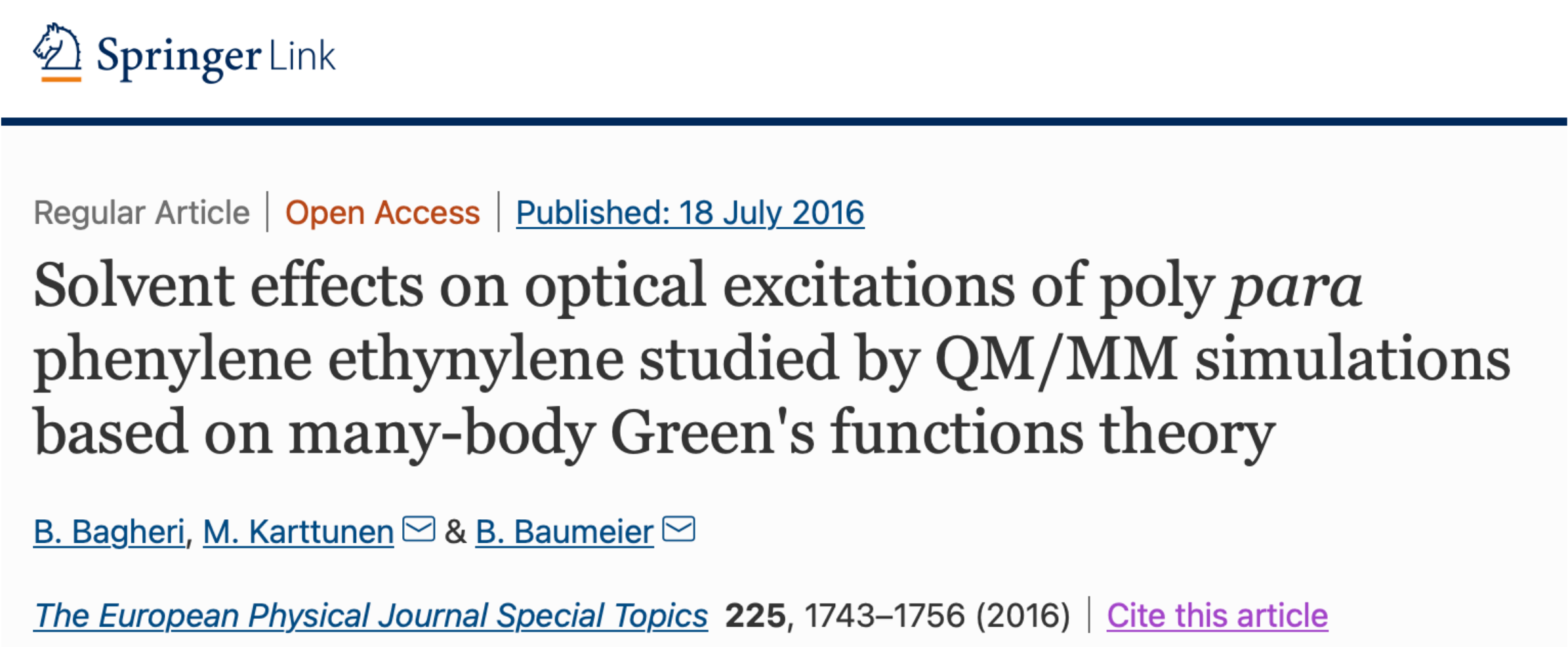 Electronic excitations in dilute solutions of poly para phenylene ethynylene (poly-PPE) are studied using a QM/MM approach combining many-body Green’s functions theory within the GW approximation and the Bethe-Salpeter equation with polarizable force field models. Oligomers up to a length of 7.5 nm (10 repeat units) functionalized with nonyl side chains are solvated in toluene and water, respectively. After equilibration using atomistic molecular dynamics (MD), the system is partitioned into a quantum region (backbone) embedded into a classical (side chains and solvent) environment. Optical absorption properties are calculated solving the coupled QM/MM system self-consistently and special attention is paid to the effects of solvents. The model allows to differentiate the influence of oligomer conformation induced by the solvation from electronic effects related to local electric fields and polarization. It is found that the electronic environment contributions are negligible compared to the conformational dynamics of the conjugated PPE. An analysis of the electron-hole wave function reveals a sensitivity of energy and localization characteristics of the excited states to bends in the global conformation of the oligomer rather than to the relative of phenyl rings along the backbone.
