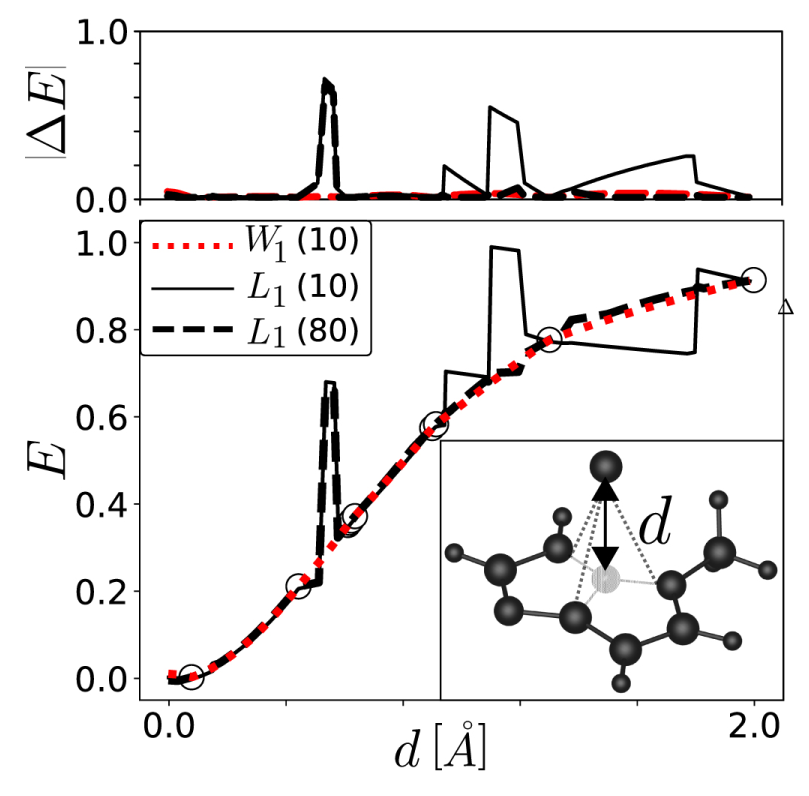 We study the Wasserstein metric to measure distances between molecules represented by the atom index dependent adjacency ‘Coulomb’ matrix, used in kernel ridge regression based supervised learning. Resulting machine learning models of quantum properties, a.k.a. quantum machine learning models exhibit improved training efficiency and result in smoother predictions of energies related to molecular distortions. We first illustrate smoothness for the continuous extraction of an atom from some organic molecule. Learning curves, quantifying the decay of the atomization energy’s prediction error as a function of training set size, have been obtained for tens of thousands of organic molecules drawn from the QM9 data set. In comparison to conventionally used metrics (L1 and L2 norm), our numerical results indicate systematic improvement in terms of learning curve off-set for random as well as sorted (by norms of row) atom indexing in Coulomb matrices. Our findings suggest that this metric corresponds to a favorable similarity measure which introduces index-invariance in any kernel based model relying on adjacency matrix representations.